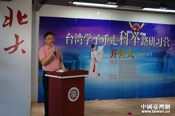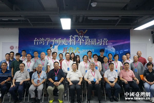 中國臺(tái)灣網(wǎng)8月21日廈門訊 8月20日下午,“臺(tái)灣學(xué)子重走科舉路研習(xí)營”在廈門北京大學(xué)創(chuàng)業(yè)訓(xùn)練營兩岸青年創(chuàng)客空間隆重開營。中華全國臺(tái)灣同胞聯(lián)誼會(huì)研究室主任陳立謙、北京市臺(tái)灣同胞聯(lián)誼會(huì)副會(huì)長王慧、北京市臺(tái)灣同胞聯(lián)誼會(huì)名譽(yù)會(huì)長盧咸池、福建省臺(tái)灣同胞聯(lián)誼會(huì)副會(huì)長蘇甦、福州市臺(tái)灣同胞聯(lián)誼會(huì)副調(diào)研員許峰、臺(tái)灣華梵大學(xué)前校長高柏園、臺(tái)灣銘傳大學(xué)廣播電視學(xué)系主任杜圣聰?shù)瘸鱿_營式。曾舉辦過“科舉制度在臺(tái)灣”高校巡展的臺(tái)灣華梵大學(xué)、銘傳大學(xué)師生和在京青年臺(tái)胞大學(xué)生組成的研習(xí)營及相關(guān)單位嘉賓50余人參加了開營式。