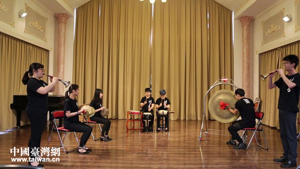 臺北藝術大學傳統音樂系的學生表演北管樂曲牌《斗鵪鶉》。(圖片來源:保定市臺辦)