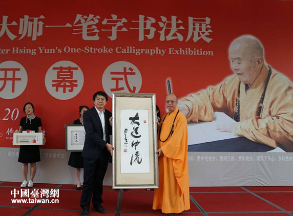 中國臺灣網5月31日貴陽訊 5月26日,“星云大師一筆字書法展”——2018中國大陸巡回展首站登陸貴陽,在貴州美術館隆重開幕。這是去年9月,貴州省“守望精神家園”非物質文化遺產赴臺灣展演交流所取得的碩果之一,也是貴州省深入貫徹中央“推動兩岸同胞共同弘揚中華文化,促進心靈契合”精神的具體舉措,是一場精彩絕倫和震撼人心的涉臺文化盛宴。