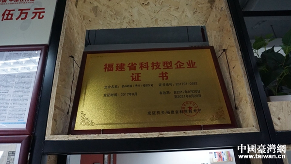 福建省科技型企業(yè)證書。(中國臺灣網(wǎng) 張玲 攝)