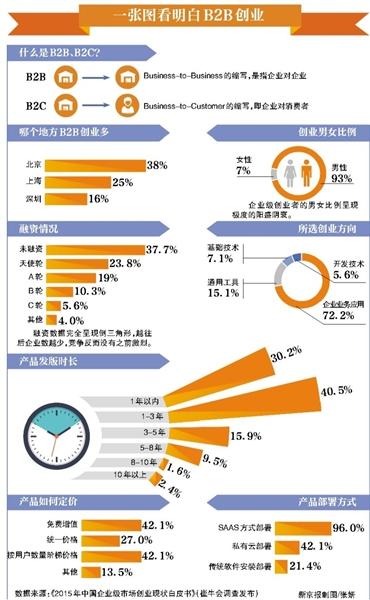 “現在的互聯網創業浪潮有點類似于19世紀加州的淘金熱。”B2B(企業對企業)創業項目“日志易”創始人陳軍說,“別的創業公司(B2C,企業對消費者)是淘金的,我們賣水、賣牛仔褲、賣鏟子、賣鋤頭,為他們提供工具和支持。”像陳軍一樣為“淘金者”服務的B2B創業項目日漸增多,但相比B2C的紅海,B2B領域仍是一片藍海。有機構曾公布過一個數據,美國企業數是2700萬家,美國有三大企業服務領軍公司,市值總和3500億美元,而中國有約2200萬家企業,卻連一家估值十億美元的B2B公司都沒有。看起來,一塊肥沃的市場正等待創客們。然而,機會真的來了嗎?在風口上,是否可以高枕無憂?今天下午,新京報聯手IDG資本,舉辦尋找中國創客論壇,以“席卷2015:B2B大風進行時”為主題,聚焦B2B領域創業。