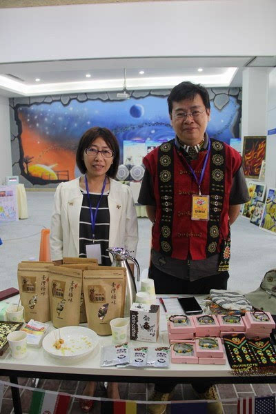 臺灣創客徐鳳儀和弟弟徐德欽在海峽兩岸創業創新創意市集上展示創業產品。王棟 圖