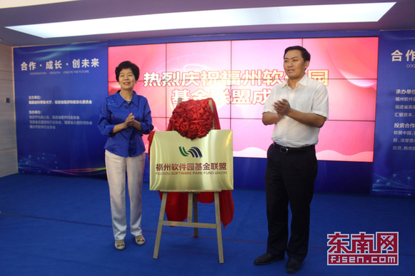 福建省科技廳副巡視員黃威(左)、福州市鼓樓區(qū)人民政府代區(qū)長(zhǎng)朱訓(xùn)志(右)為“福州軟件園基金聯(lián)盟”揭牌。