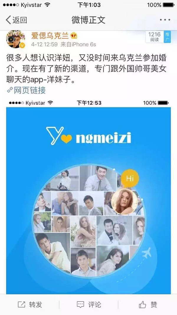此次和跨國婚戀明星梅愛偲的合作,洋媚子也迅速鋪展跨國婚介市場。據了解,雙方合作后的“酷愛洋媚子”正式推出了“中國——烏克蘭相親旅游”專線,分為團體相親、個人相親和VIP相親三種套餐(費用為4.2萬至9.6萬不等),由梅愛偲在烏克蘭專程接送。正規交友,嚴肅婚戀,5月16日正式開啟限額招募團員。