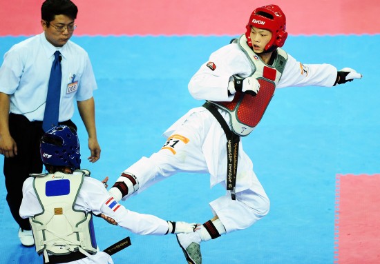 Wei Chen Yang of Chinese Taipei beat Pen Ek Karaket of Thailand to take the men's 58kg taekwondo gold medal at the 16th Asian Games.(Photo: ChinaTaiwan)