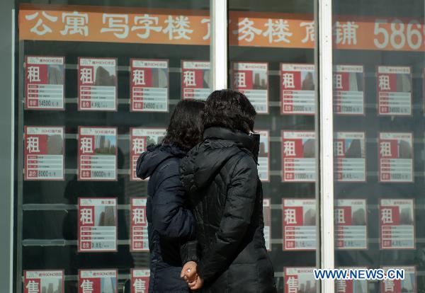 Pedestrians pass by a real-estate agent in Beijing, capital of China, Feb. 14, 2011. (Xinhua/Zhao Wanwei)