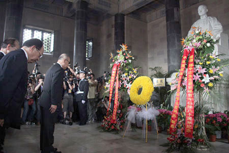 Kuomintang (KMT) Chairman Wu Poh-hsiung (2nd R, front) addresses during his visit to the mausoleum of Dr. Sun Yat-sen in Nanjing, capital of east China's Jiangsu Province, June 1, 2009. Wu visited the mausoleum of Dr. Sun Yat-sen, the founding father of the Kuomintang Party and the forerunner of the anti-feudalism revolution in China, and participated in the activities commemorating the 80th anniversary of the official burial of Dr. Sun in Nanjing on Monday. (Xinhua/Xing Guangli)