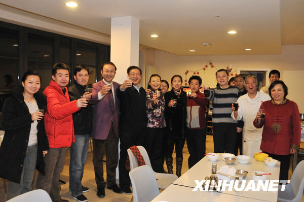 歐洲總分社大年二十九舉辦新年招待會,中國駐比利時王國使館張援遠大使(左二)出席,歐洲總分社劉江社長(左三),姜巖副社長(左一) 新華網發