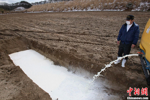 3月23日,日本福島縣Iitate,一位農(nóng)民將牛奶倒入土坑中。福島縣周邊地區(qū)原奶和蔬菜等農(nóng)畜產(chǎn)品的受輻射污染范圍23日呈擴大態(tài)勢,首相菅直人當天首次要求人們不要食用福島縣生產(chǎn)的一些種類的農(nóng)產(chǎn)品。