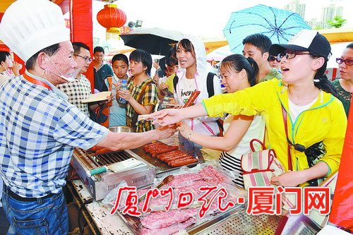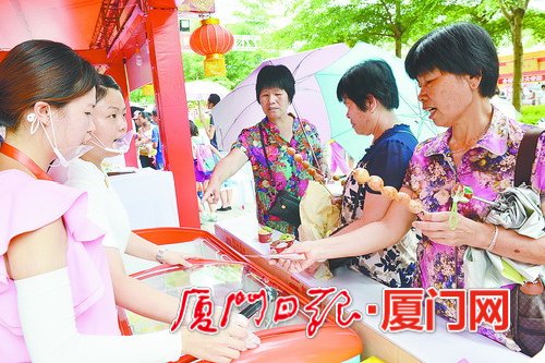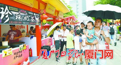 昨天上午10時許,海滄市民文化廣場上,來自兩岸的特色美食香味四溢,紅、黃兩色帳篷下,到處人頭攢動,熱鬧非凡。眾多市民游客聞訊而來,競相品嘗來自臺灣的地道美食。據介紹,本屆廟會共設攤位210個,其中170家來自臺灣,覆蓋臺灣21個縣市,規模之大超越往屆。