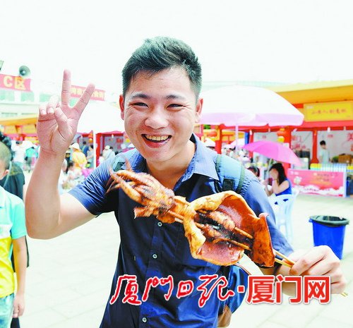 “前兩屆廟會我們都來參加,品嘗了許多‘古早味’臺灣美食。今年的廟會又帶來了更多的驚喜。”來自島內的市民林先生一邊啃著萬鸞醬烤豬腳,一邊對記者說。放眼望去,整個海滄市民文化廣場熙熙攘攘,成了一片歡樂的海洋。