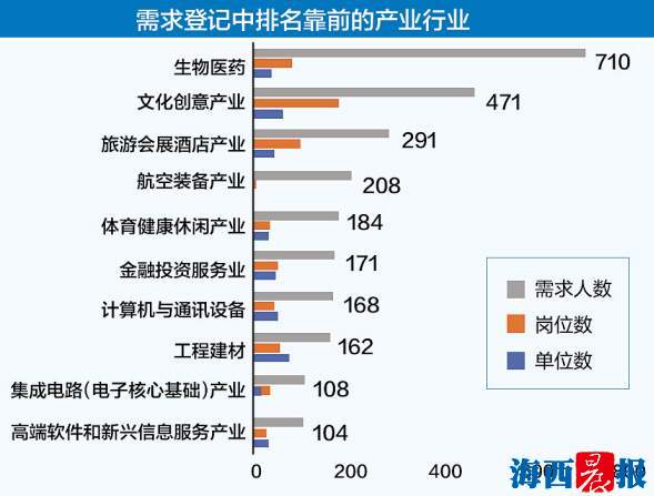據(jù)統(tǒng)計(jì),本次需求登記中排名靠前的產(chǎn)業(yè)行業(yè)主要有生物醫(yī)藥、文化創(chuàng)意產(chǎn)業(yè)、旅游會(huì)展酒店業(yè)、航空裝備產(chǎn)業(yè)、體育健康休閑產(chǎn)業(yè)、金融投資服務(wù)業(yè)、計(jì)算機(jī)與通訊設(shè)備、工程建材等。其中,生物醫(yī)藥行業(yè)需求710人,占需求總數(shù)24.2%,文創(chuàng)產(chǎn)業(yè)需求471人,占比16.05%。