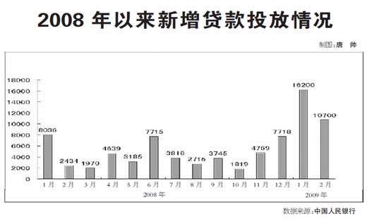 再?gòu)膶?shí)踐看,前兩月人民幣貸款大幅猛增了2.69萬(wàn)億元。這是信貸規(guī)模限制取消、4萬(wàn)億元政府投資項(xiàng)目啟動(dòng)等外因與銀行慣于“早投放、早受益”等內(nèi)因碰頭的結(jié)果,隨著政府投資項(xiàng)目中優(yōu)質(zhì)項(xiàng)目被不斷“瓜分”,加上各家銀行開始適度控制信貸投放進(jìn)度,信貸增長(zhǎng)將逐步回落。但從全年看,仍有望在5萬(wàn)億元以上。