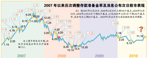 此前,10月11日,央行通知工農中建四大國有商業銀行及招商、民生兩家股份制銀行,提高上述幾家銀行的存款準備金率,提高幅度為50個基點,凍結資金約3000億元。本次調整存款準備金凍結資金的規模預計少于上次。 在10月19日,央行宣布加息,兩次政策出臺之間僅間隔10天左右。