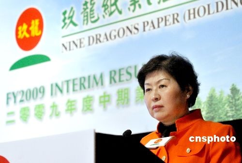 資料圖:2009年3月17日,中國最大箱板原紙產品生產商玖龍紙業(控股)有限公司在香港舉行2009年度中期業績發布會。集團董事長張茵出席公布業績。 中新社發 鄧慶樂 攝