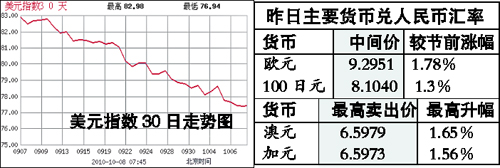 自9月30日以來,美元指數由78.81下跌至昨日下午4時的77.50,整個假期下跌幅度為1.66%。其中歐元兌美元匯率假期間最大漲幅達2.85%;澳元兌美元更是于本周四最高觸及0.9916,創下27年來的新高,假期最高漲幅達2.5%。