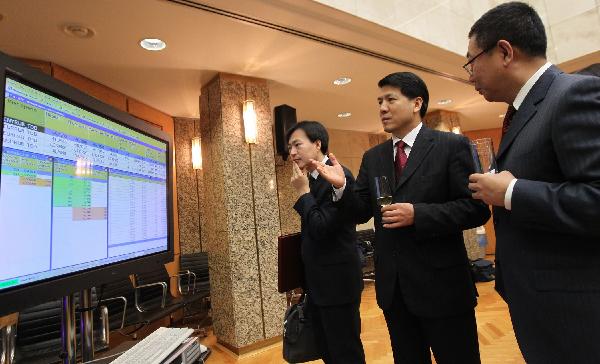 12月15日,在俄羅斯莫斯科銀行間外匯交易所,中國駐俄羅斯大使李輝(右二)等人觀看盧布對人民幣交易情況。盧布對人民幣掛牌交易當日在俄羅斯莫斯科銀行間外匯交易所正式啟動,這也是人民幣首次在中國境外直接掛牌交易。 新華社記者魯金博攝