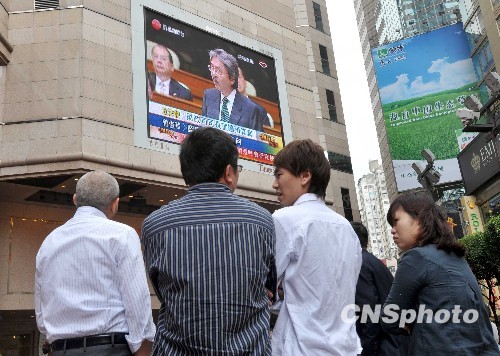 2月24日,香港財政司司長曾俊華在立法會宣讀2010至2011年度財政預算案。不少市民駐足在時代廣場大型電視前觀看直播情況。 中新社發 鄧慶樂 攝
