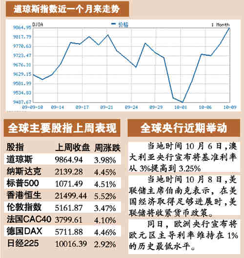 上周全球股市大幅上漲,主要股指平均漲幅超過4%。紐約三大股指上周五收盤小幅上漲,道指收于9864.94點(diǎn),創(chuàng)一年來新高,離萬元大關(guān)僅一步之遙。香港恒指上周漲1123.95點(diǎn),漲幅達(dá)5.52%。
