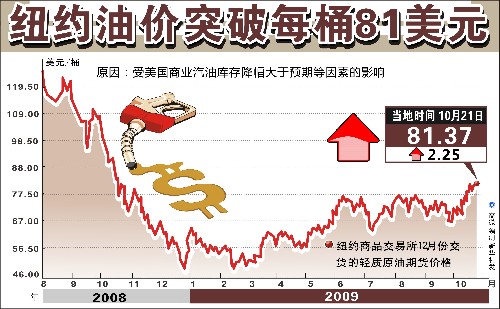 受弱勢美元指數和大幅減少的汽油庫存影響,10月21日,紐約原油期貨的收盤價一年來首次突破每桶81美元。