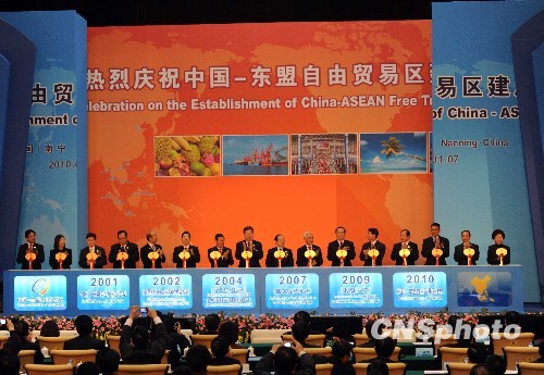 二0一0年一月七日,對(duì)于十三億中國(guó)人和六億東盟國(guó)家的民眾來說,將是一個(gè)被寫入雙邊交往史的日子——這一天,東盟和中國(guó)在廣西南寧市共同舉辦了中國(guó)—東盟自貿(mào)區(qū)建成儀式。