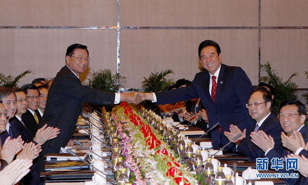 6月29日上午9時(shí),兩岸兩會(huì)領(lǐng)導(dǎo)人第五次會(huì)談在重慶舉行,海協(xié)會(huì)會(huì)長陳云林和海基會(huì)董事長江丙坤在會(huì)談中將就簽署兩岸經(jīng)濟(jì)合作框架協(xié)議及兩會(huì)后續(xù)商談議題等交換意見。這是陳云林(右)和江丙坤(左)在會(huì)談前握手。新華社記者陳建力攝