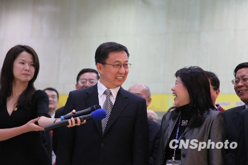 4月6日上午11時(shí)許,上海市長韓正率團(tuán)搭乘班機(jī)抵達(dá)臺北松山機(jī)場,展開以深化雙城合作、推介上海世博為主軸的“攜進(jìn)之旅”。圖為韓正在機(jī)場入境大廳向記者發(fā)表簡短講話,與臺北市副市長李永萍相視一笑。 中新社發(fā) 董會峰 攝