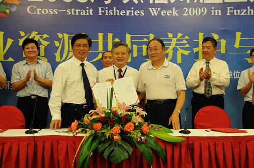 9月21日,福建省海洋學會代表(前排右)、福建省水產學會代表(前排左)與臺灣海洋大學代表(前排中)簽署《海峽兩岸海洋與漁業學術交流與合作意向書》。新華社記者 來建強 攝