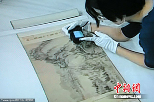 5月18日,《剩山圖》在北京正式點(diǎn)交給臺(tái)北故宮博物院,邁出“合璧”的關(guān)鍵一步,《剩山圖》也在一個(gè)特殊的房間內(nèi)進(jìn)行首次對(duì)外展開式點(diǎn)交查驗(yàn)。 朱引煒 攝 圖片來源:CFP視覺中國