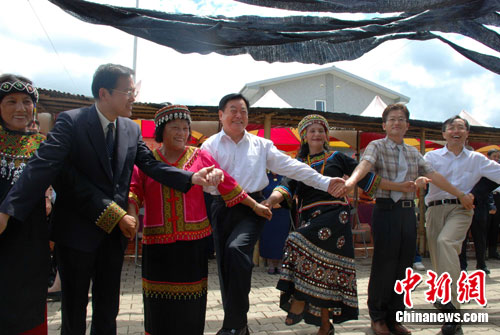 5月22日,四川省長蔣巨峰一行探訪臺灣高雄杉林鄉(xiāng)大愛園區(qū),向當(dāng)?shù)赜懡虨?zāi)后重建經(jīng)驗,并與受“8·8”風(fēng)災(zāi)影響遷移到園區(qū)的民眾手拉手跳舞。中新社發(fā) 劉賢 攝
