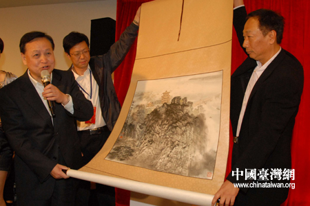 湖北省委書記羅清泉向鴻海集團董事長郭臺銘贈送禮品。(中國臺灣網湖北通訊員 陸勝 攝)