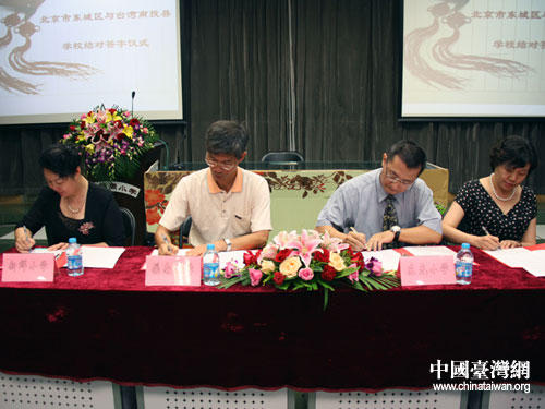 中國臺灣網7月12日北京消息 7月11日,南投縣埔里鎮溪南國小與東城區新鮮胡同小學,南投縣魚池鄉東光國小與東城區府學胡同小學結對簽字儀式在府學小學舉行。