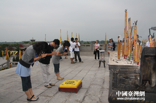 祭奠廣場前,團員們正在上香拜祭祖先(中國臺灣網 陳寧 攝)