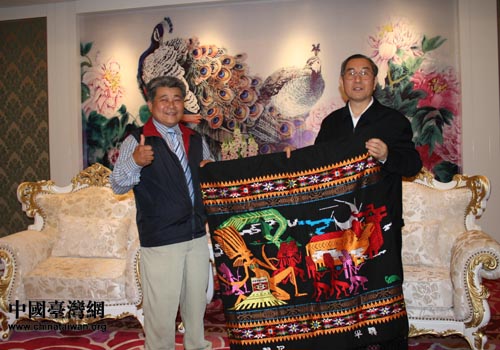 廣西壯族自治區主席馬飚(右)向臺灣花蓮農民代表團贈送廣西壯族特色工藝品壯錦。(圖片來源:廣西臺辦)