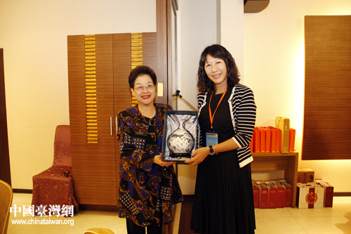 中國(guó)青年大陸研究文教基金會(huì)董事長(zhǎng)李鐘桂博士與中國(guó)宋慶齡基金會(huì)基金部部長(zhǎng)暨本次代表團(tuán)團(tuán)長(zhǎng)唐九紅女士互贈(zèng)禮物。 (中國(guó)臺(tái)灣網(wǎng) 于斯文 攝)
