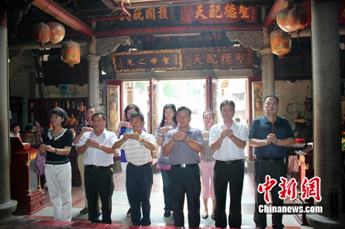 8月4日,臺(tái)灣高雄縣前縣長楊秋興(前左三)率團(tuán)前往“媽祖故里”福建湄洲島參訪期間,到媽祖祖廟“天后宮”祭拜媽祖。楊秋興稱自己的生日是3月23日,與媽祖同一天出生,到媽祖祖廟拜謁媽祖是他一直的夙愿。楊秋興此次率團(tuán)首次到福建開展“宗教朝圣之旅”,以期用宗教、民俗文化加深兩岸的交流交往。(王華育 攝)