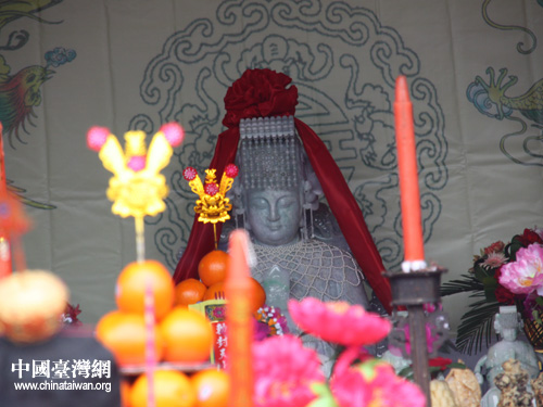 10日下午,湄洲媽祖祖廟受贈翡翠媽祖像儀式,在莆田市湄洲島天后廣場舉行,圖為開光典禮前的翡翠媽祖像。(中國臺灣網(wǎng) 楊麗 攝)