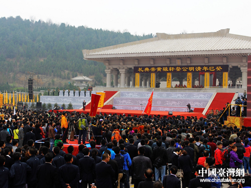 中國臺(tái)灣網(wǎng)4月4日黃陵消息 4月4日上午癸巳年(2013)清明公祭軒轅黃帝典禮在陜西黃陵縣舉行,萬余名海內(nèi)外中華兒女聚首陜西省黃陵縣橋山軒轅殿祭祀廣場,追念初祖功德,表達(dá)追思之情。
