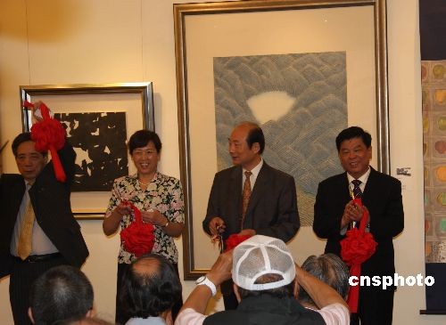 圖為中國文聯(lián)副主席胡振民(右一)、中國文聯(lián)港澳臺辦公室主任黃文娟(左二)、臺北藝術(shù)大學(xué)校長黃光男(左一)為畫展開幕剪彩。