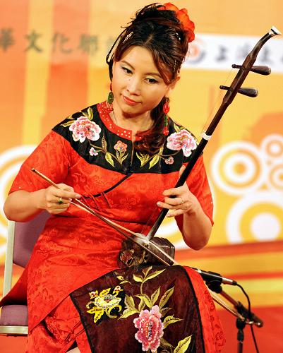 10月15日,國家一級演員馬曉暉在新聞發布會上表演二胡獨奏《草原賽馬》。新華社發(吳景騰 攝)