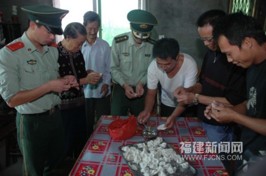 福清南青嶼赤表村84歲高齡的林金鈿老人和福清南青嶼邊防官兵、臺(tái)胞等一起包餃子。