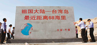 新華網(wǎng)消息 據(jù)香港文匯報(bào)報(bào)道,大陸距臺最近地點(diǎn)福建平潭島30日設(shè)立石碑,與臺灣新竹已有的石碑遙相呼應(yīng),共同標(biāo)注兩岸最近距離,臺灣新竹市長林政則更是親自為石碑揭幕。平潭島距臺灣新竹南寮漁港近僅68海里,約為126公里。記者看到,此次在平潭設(shè)立的石碑高3米、寬5米,上書“祖國大陸─臺灣島最近距離68海里”,并雕刻了海峽兩岸位置圖。