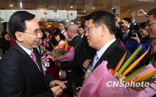 “二00九年廣州市授予榮譽市民大會”十一月二十六日在廣州舉行,大會向二十六位海外僑胞、港澳臺同胞和國際友人授予廣州市榮譽市民稱號,以表彰他們多年來對廣州市經濟建設和社會公益事業等方面做出的貢獻。這次被授予稱號的二十六位榮譽市民中,香港同胞十人,澳門同胞兩人,臺灣同胞六人,外籍華人兩人,外國友人六人。據不完全統計,這二十六位榮譽市民多年來在廣州市共投資和引資一百二十九億元人民幣,捐贈和引薦捐資二點五二億人民幣。圖為廣州市委書記朱小丹在東方賓館迎接榮譽市民。中新社發 羅仰明 攝