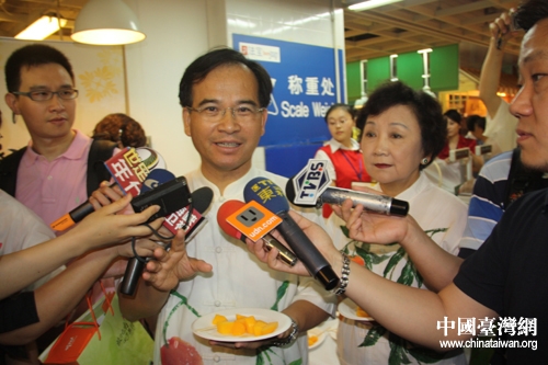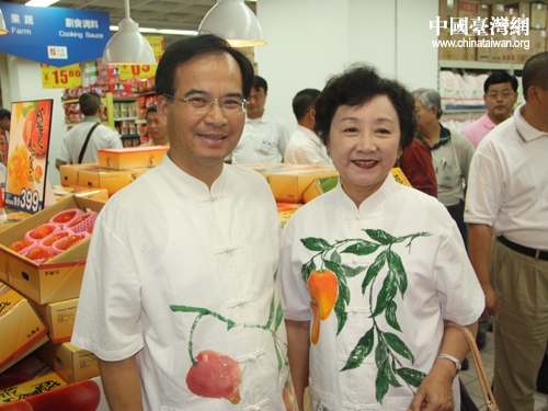 中國臺灣網6月16日北京消息 適逢端午佳節,臺南縣長蘇煥智一行專程來到北京統杰法寶超市西直門店參加臺灣特產——愛文芒果推廣活動。推廣會上,蘇煥智夫婦熱心當起推銷員,向到場市民介紹并現場贈送芒果,此舉吸引了大批市民排隊品嘗。