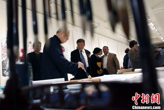 12月14日,大陸著名的開明畫院臺北書畫展在臺北開幕。兩岸畫家還當場揮毫,進行了一場別開生面的中國書畫筆會。圖為臺灣著名畫家、中研院嶺南美術館榮譽館長歐豪年在筆會上作畫。中新社記者 黃少華 攝