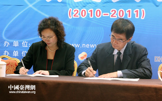 中國臺灣網總經理總編輯劉曉輝(左)與臺灣亞洲大學副校長鄧成連教授(右)簽訂2012海峽兩岸大學生網絡商務創新應用大賽合作意向書。(中國臺灣網 李丹 攝)