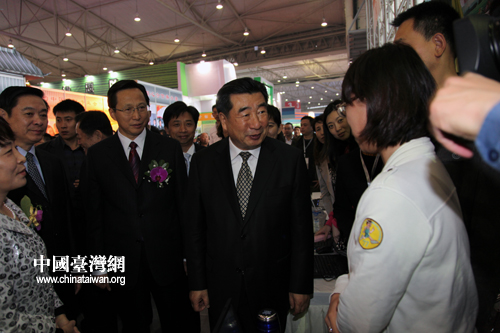 第九屆中國國際農產品交易會開幕式前,國務院副總理回良玉(中)等領導視察展館現場,并與本網記者親切交談。(圖片來源:農業部信息中心)