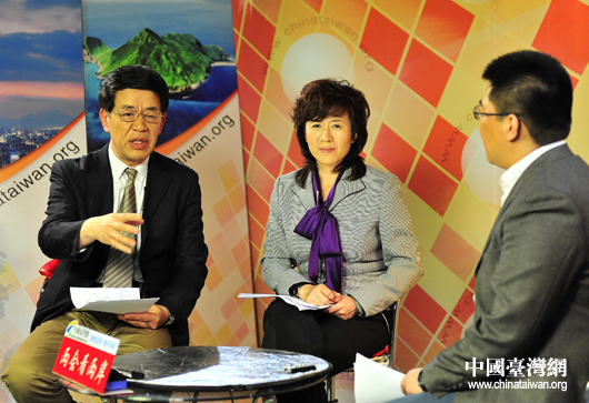 資深臺(tái)灣問(wèn)題專家中國(guó)社會(huì)科學(xué)院臺(tái)灣研究所副所長(zhǎng)謝郁(左二)和北京聯(lián)合大學(xué)臺(tái)灣研究院劉紅教授(左一)在接受本網(wǎng)視頻專訪。(中國(guó)臺(tái)灣網(wǎng) 劉海偉 攝)