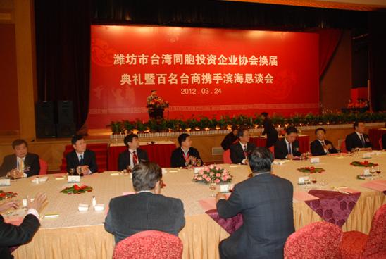 中國臺灣網3月26日濰坊消息 3月24日,濰坊臺商協會換屆典禮暨百名臺商攜手濱海懇談會在富華大酒店舉行。濰坊市委書記許立全會前親切會見了蒞會的嘉賓代表,市委副書記、市長劉曙光在典禮上致辭。臺灣知名人士施炯良、全國臺灣同胞企業聯誼會副會長王克璋、山東省臺辦副主任曹曉武等出席典禮。