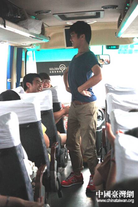 前往蘇州的路上,來自臺北教育大學的陳昱達在車上表演舞蹈。(中國臺灣網 孟雅詩 攝)